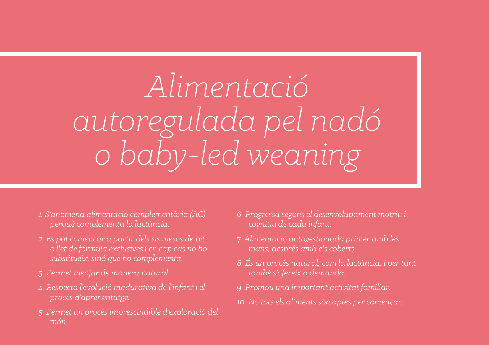 - És un procés natural, com la lactància, i per tant també s’ofereix a demanda. Mai s’ha de forçar un nadó a menjar. L’autoregulació pot deteriorar-se i passar factura en la futura infància, on la criatura no sabrà reconèixer quina quantitat de menjar el fa sentir saludable.