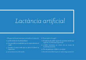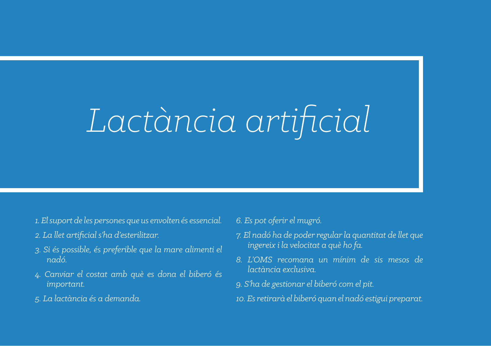 El suport de les persones que us envolten és essencial. Els nadons necessiten el contacte amb la mare per sentir-se segurs i poder ser alimentats de manera freqüent. El suport de la parella i l’entorn proper, tant en la vessant més emocional com més pràctica (tasques de la llar, visites, encàrrecs…), afavoreix el descans de la mare i el nadó.- La llet articial s’ha d’esterilitzar. És necessari preparar els biberons de llet artificial tal com recomana el fabricant, ja que la llet en pols pot contenir bactèries. S’ha d’escalfar l’aigua on prepararem la llet de fórmula a 70 graus per esterilitzar la llet en pols i després